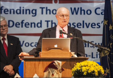 Shown above is Steve Ham who is the Senior Director of Worldwide Outreach for Answers In Genesis, a Creationist ministry well known for its Creation Museum near Cincinnati. Mr. Ham addressed a record breaking crowd of close to 700 attendees at this year’s Right To Life Banquet. A native of Australia, Mr. Ham moved his family to the United States in 2009. Using PowerPoint/video presentation, Mr. Ham showed that the earth’s origin comes from a Creator God not a mindless big bang. It was his position that since mankind was created by God in God's image, than all human life is sacred from the moment of conception to the moment of death. He went on to say that the evolutionist sees man as nothing more than a collection of random molecules, therefore the evolutionist view of human life is subjective depending on such factors as a person' ability, development, race, contribution to society and age. In contrast, the view that all men are in God's image results in the objective conclusion that all men are of equal value. Therefore the life of a developing baby in the womb is just as valuable as the adult who contributes to society. Likewise, the disabled and impaired are no less important than the able and unimpaired.