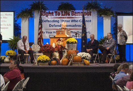 Pictured above is Marvin Arvin (left) former President of Martin County Right To Life as he is presented the 2014 Donna Gentry Pro-Life Award by Daviess County Right To Life President Louis Kavanaugh Jr.. The presentation was made at the Annual Daviess-Martin-Pike County Right To Life Banquet held this past Thursday night at the Simon J. Graber Building. Arvin has served as President of Martin County Right To Life for much of the last 30 years and has also served in various capacities for the Organization. Marvin and his Wife Virginia live in rural Loogootee. It was announced that State Senator John Waterman was the other recipient of the Pro-Life Award but was not able to attend the Banquet. The Banquet was attended by 600-700 people and was one of the Largest Crowds ever for the county groups.