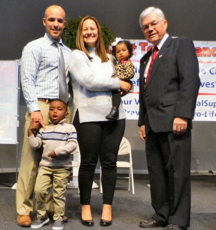 Shown here in front is Mike Winninger, his adopted son Elijah Lee, Jill Wininger holding her adopted daughter Anna Louise and Louis Kavanaugh Jr., President of Daviess County Right to Life. The Wininger Family was honored at the Right to Life Banquet as the 2019 Adoptive Family as they have adopted two children in the last several years. Speaking on behalf of the family Jill spoke of how she always wanted to adopt children that after they would have children of their own. But that was not going to be possible so they began the process of preparing for adoption. Jill spoke of the excitement of receiving those calls telling them that their prayers had been answered as they were about to become parents. She said they were always pro-life but this has made them even more attentive to the fact that all young mothers should be encouraged to choose life over abortion and she praised the work of the Right to Life organization and the Pregnancy Care Center for their work in the trying to end abortion and for the care of mothers in unplanned pregnancies.